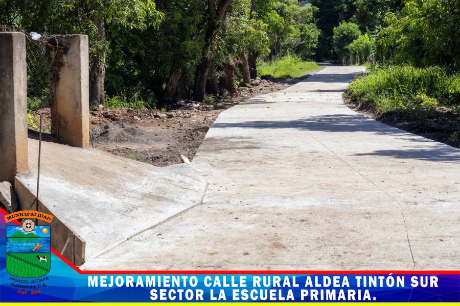 La municipalidad de Pasaco continúa con el proyecto mejoramiento calle rural de Aldea el Tintón Sur sector la escuela primaria, los trabajos consisten en la colocación del pavimento rígido, un proyecto ejecutado por la Municipalidad de Pasaco con fondos de CODEDE dicho proyecto viene a beneficiar a muchas comunidades del Municipio.