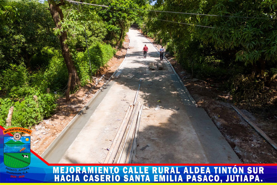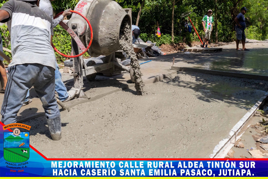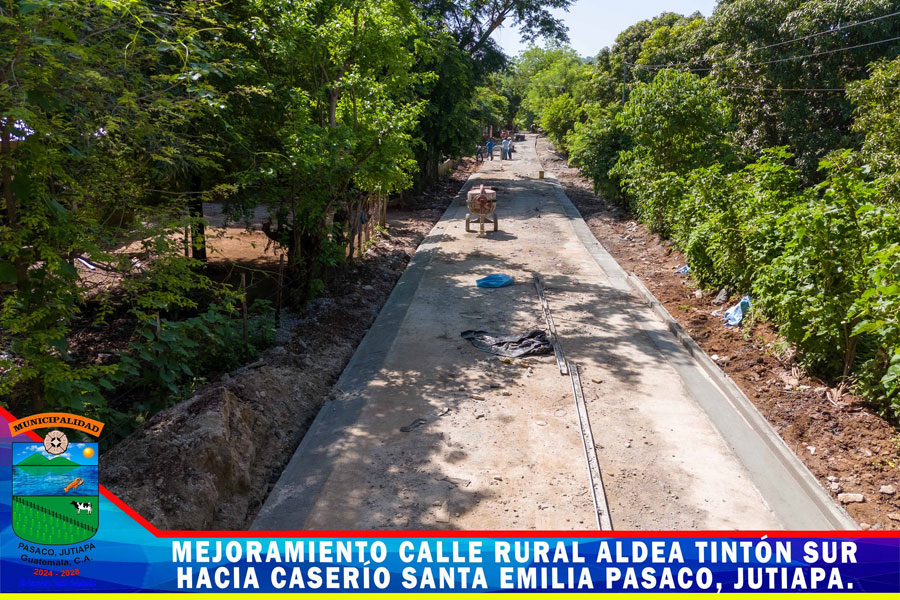 La Municipalidad de Pasaco continúa con el proyecto mejoramiento calle rural Aldea Tintón Sur hacia Caserío Santa Emilia Pasaco, los trabajos consisten en la colocación del pavimento rígido, y cuneta tipo L, corte y sellado.